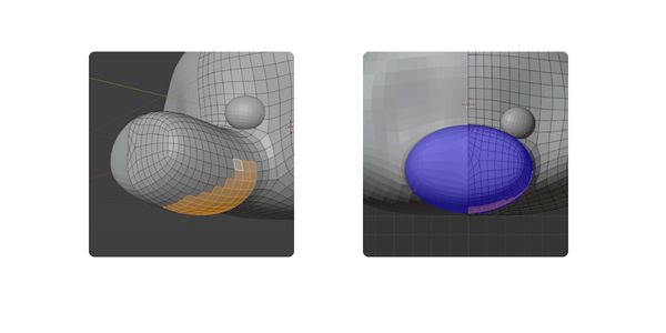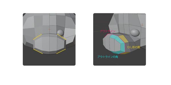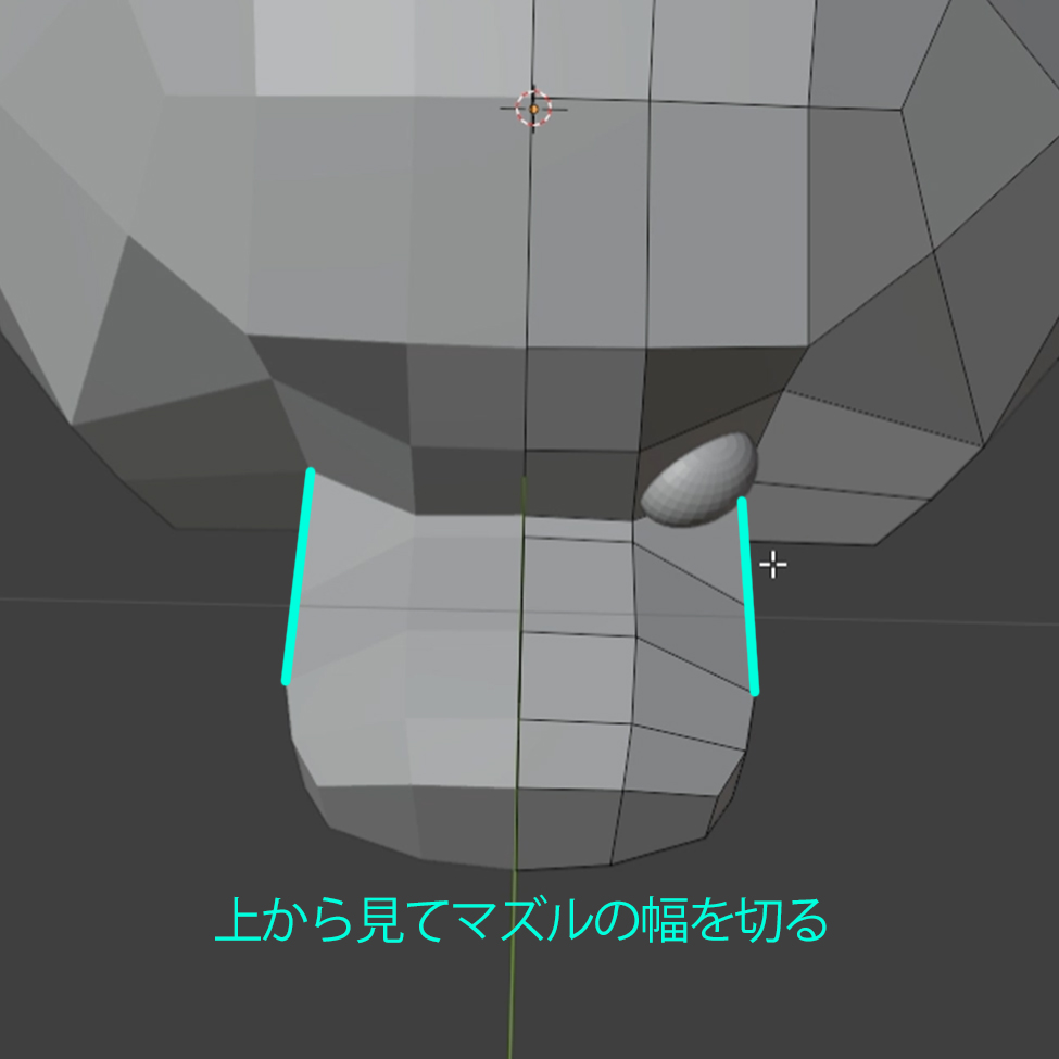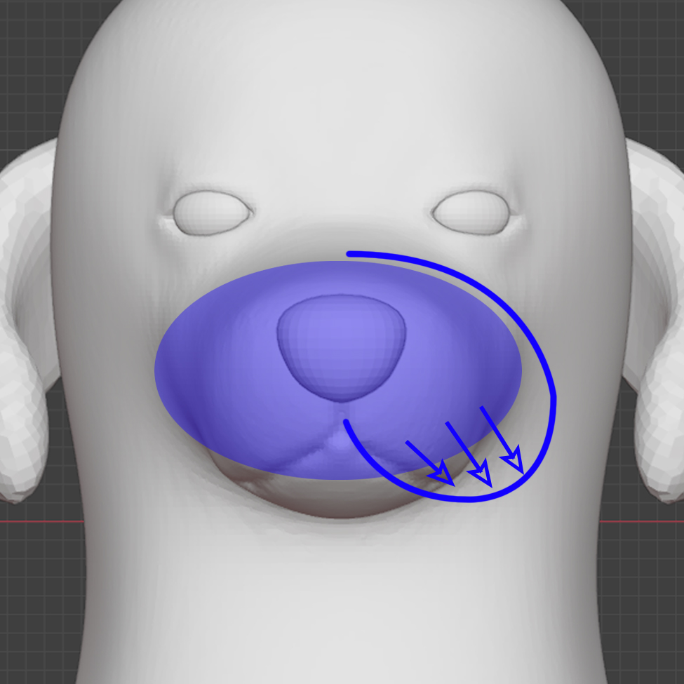 頬の毛を足すとマズルが大きくなりすぎてしまう場合は、この4面でひし形を作るよう詰めることと、アウトラインに沿った角をしっかり落とすことで、可愛い形のままコンパクトなマズルが作れます