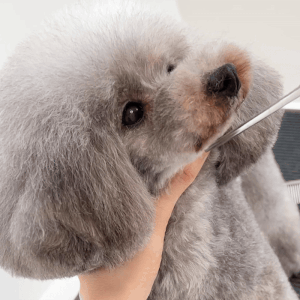 犬が後ろに下がって上を向くことで、下からの角度で見てしまい奥の毛を切りすぎてしまっている