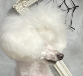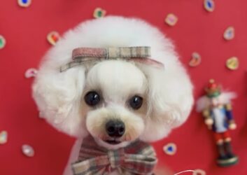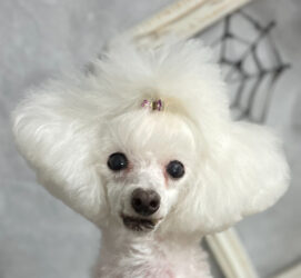 トップノットを伸ばしたこともあるのですが、普段は飼い主さんがゴムでなく挟むやつでトップノットをとめていることもあり、あまり量が増やせないので、真ん中2つに分かれた部分が長くなるだけという形に。